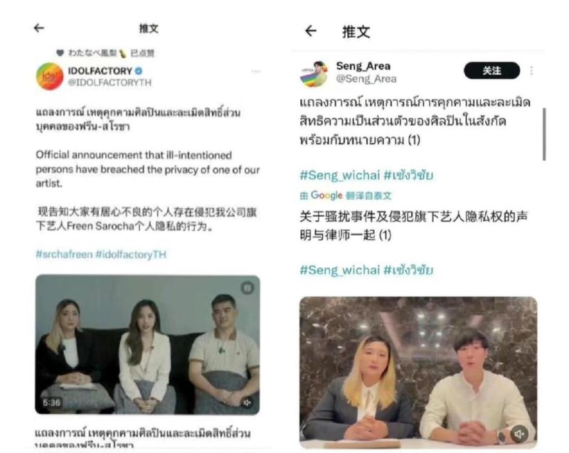 在視頻曝光之後,Freen和Seng立刻成了熱搜人物,隨後兩人同時發視頻回應,承認了視頻屬實,更表示自己的粉絲被威脅索要錢財,不給就公開視頻曝光醜聞。而律師團隊也已經第一時間收集了證據,並已經向警方報案。Freen也表示事發後心態和精神都受到極大的影響,為擔心私人生活及居住空間的安全性,已第一時間報警起訴。