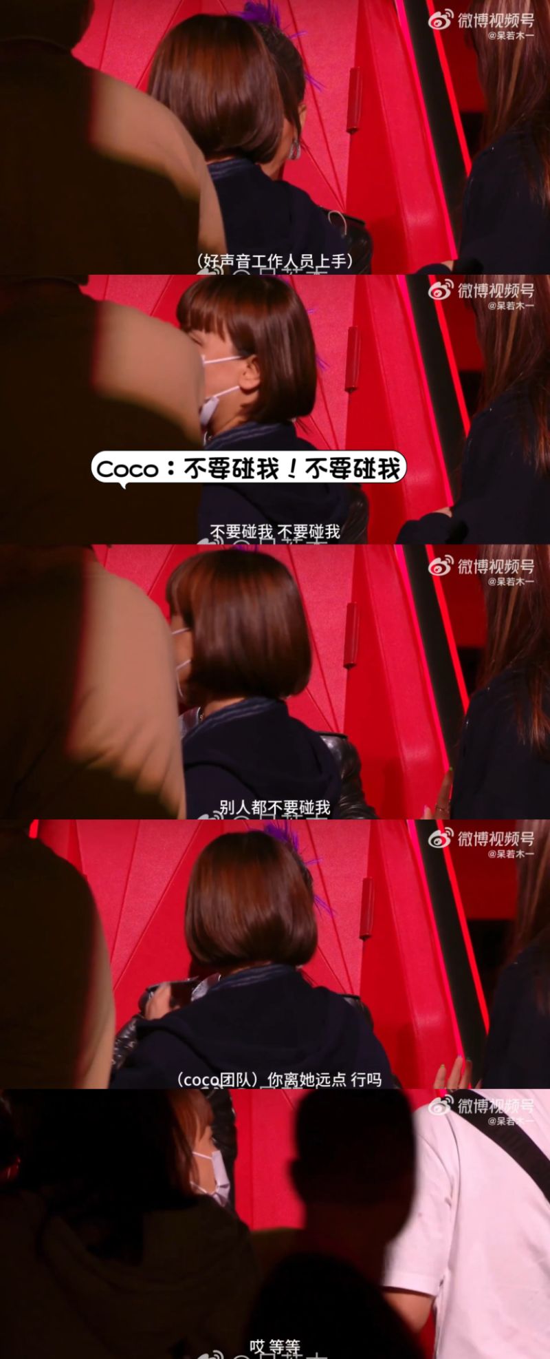 而視頻中,也可以看見有電視台工作人員上前,但由於拍攝角度被Coco工作人員擋著,所以看不清楚,但明顯聽見Coco大喊:「不要碰我,不要碰我,別人都不要碰我!」而Coco團隊人員則要求對方:「你離她遠點,行嗎?」、「哎~等等」等!