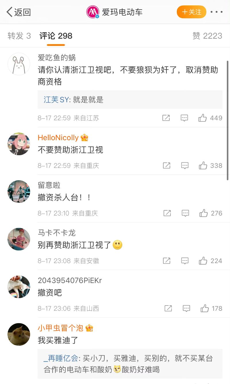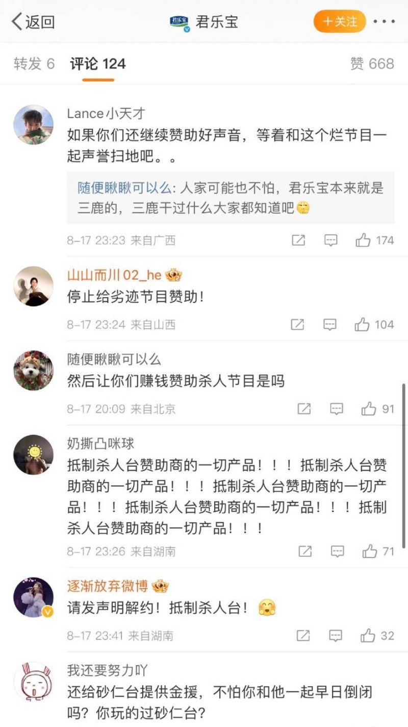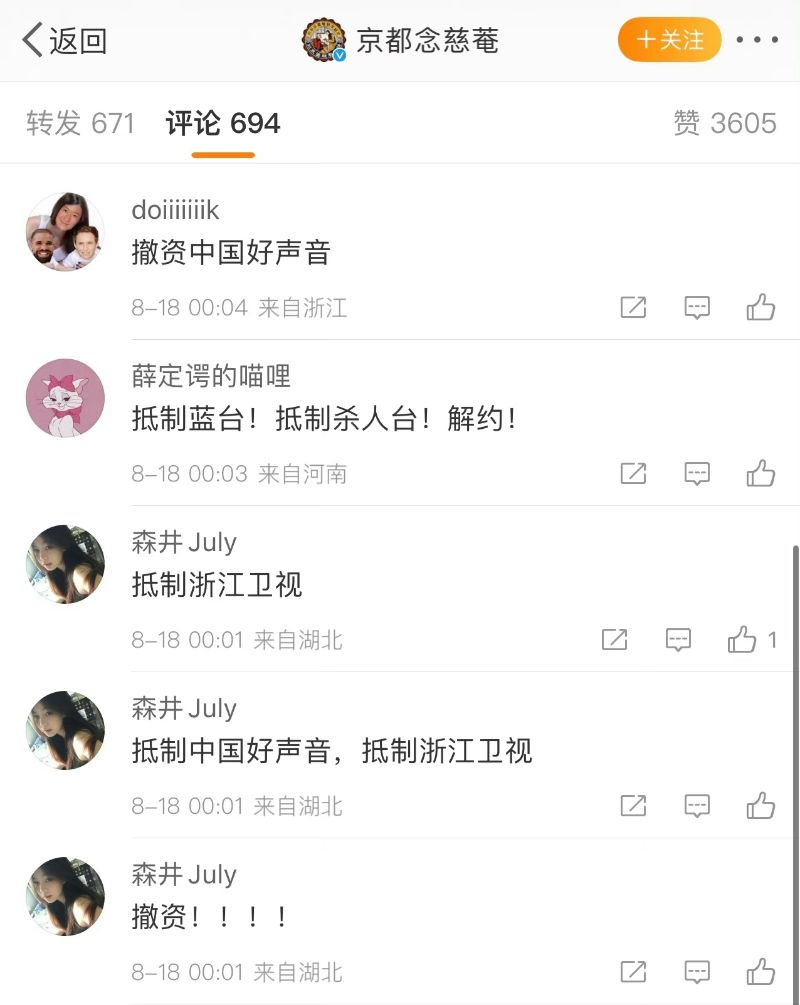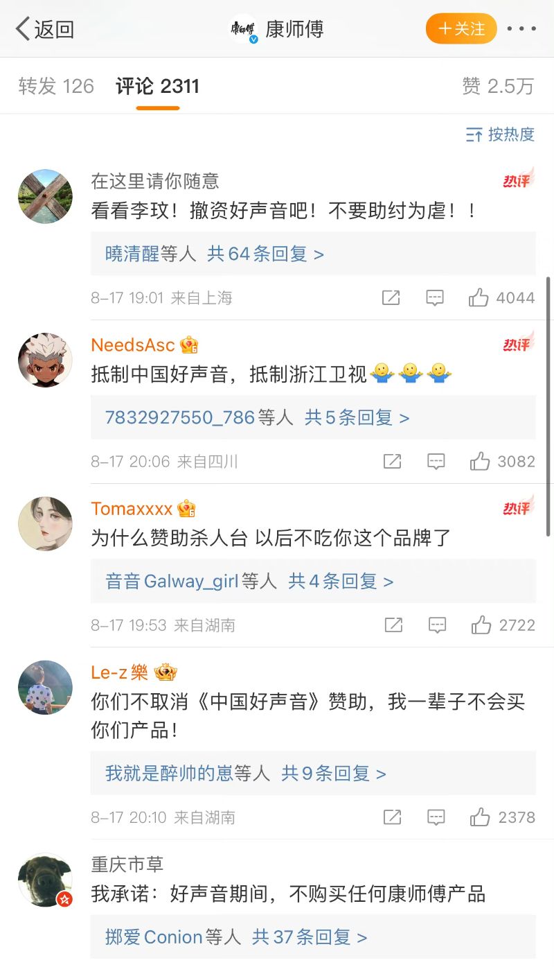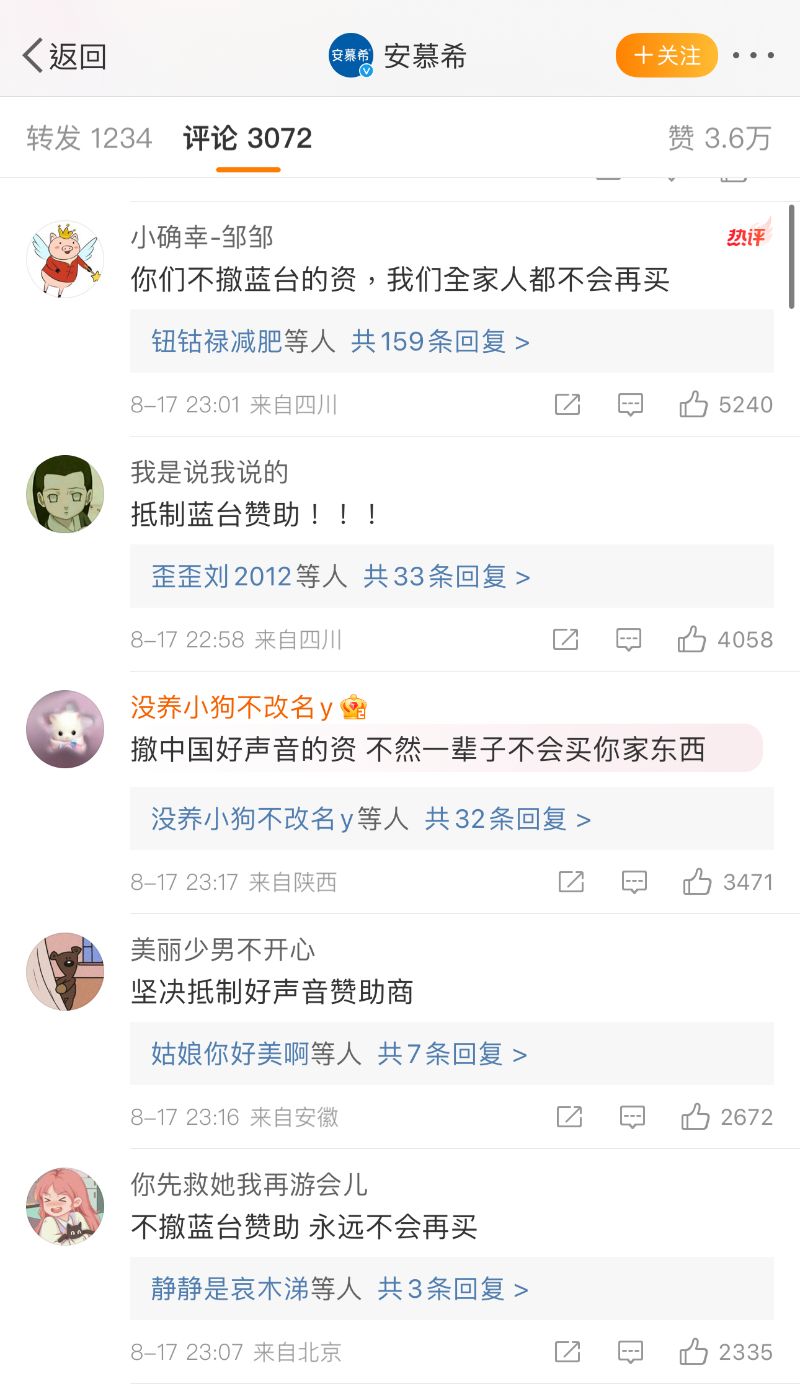 目前,中國網友發起抵制《中國好聲音》節目行動,甚至沖了節目贊助商的微博,各大品牌評論區都在要求撤掉在浙江衛視的節目贊助👇