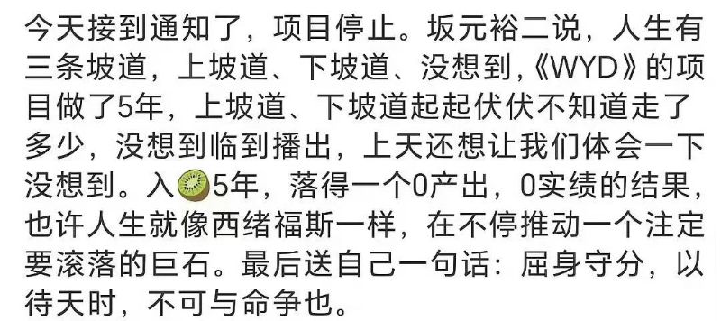雖然還沒蓋棺定論,但有疑似愛奇藝工作人員發文,表示已經收到通知,《無憂渡》這個項目算是正式停止了。他表示自己加入愛奇藝5年,落得一個零產出、零實績的結果👇