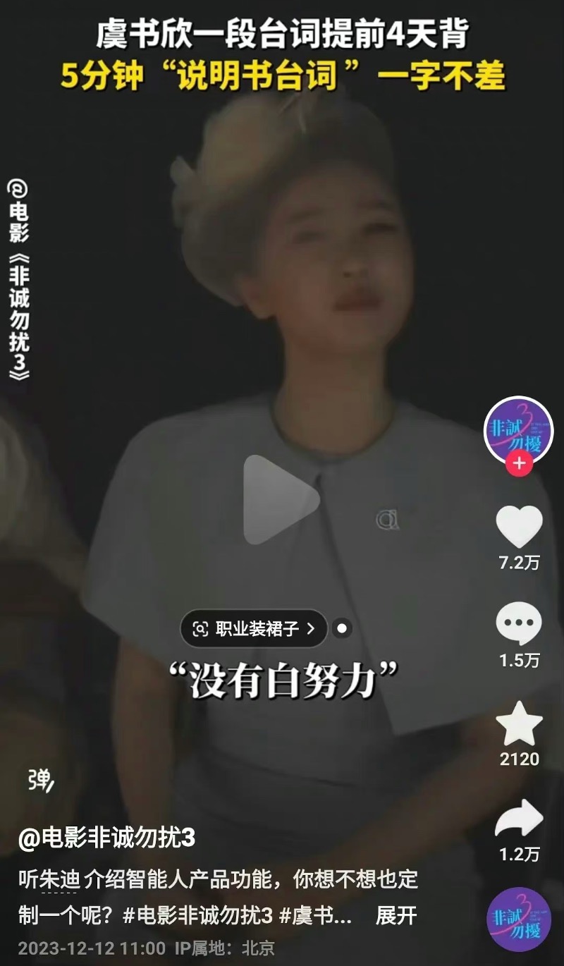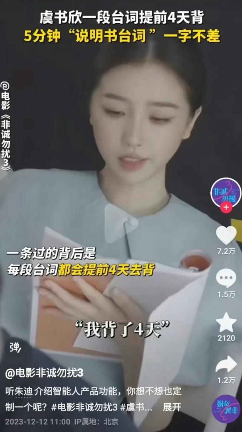 沒想到這次爭議還沒結束,《非誠勿擾3》官方社交號更新了有關虞書欣的幕後花絮,展示她為了電影中的5分鐘台詞,提早4天做準備,拍攝當天一take就過👇