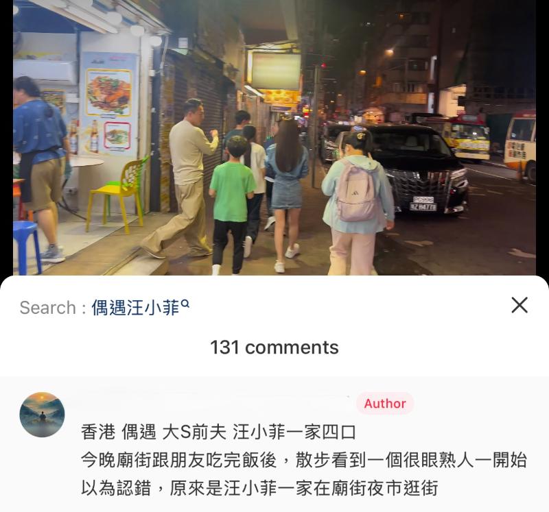 不過隨著監護權移交回給生父汪小菲,一對兒女似乎也在父親和妻子Mandy身邊展開新的生活。近日,就有IP在香港的網友,發文表示在廟街夜市偶遇汪小菲一家人買牛雜👇
