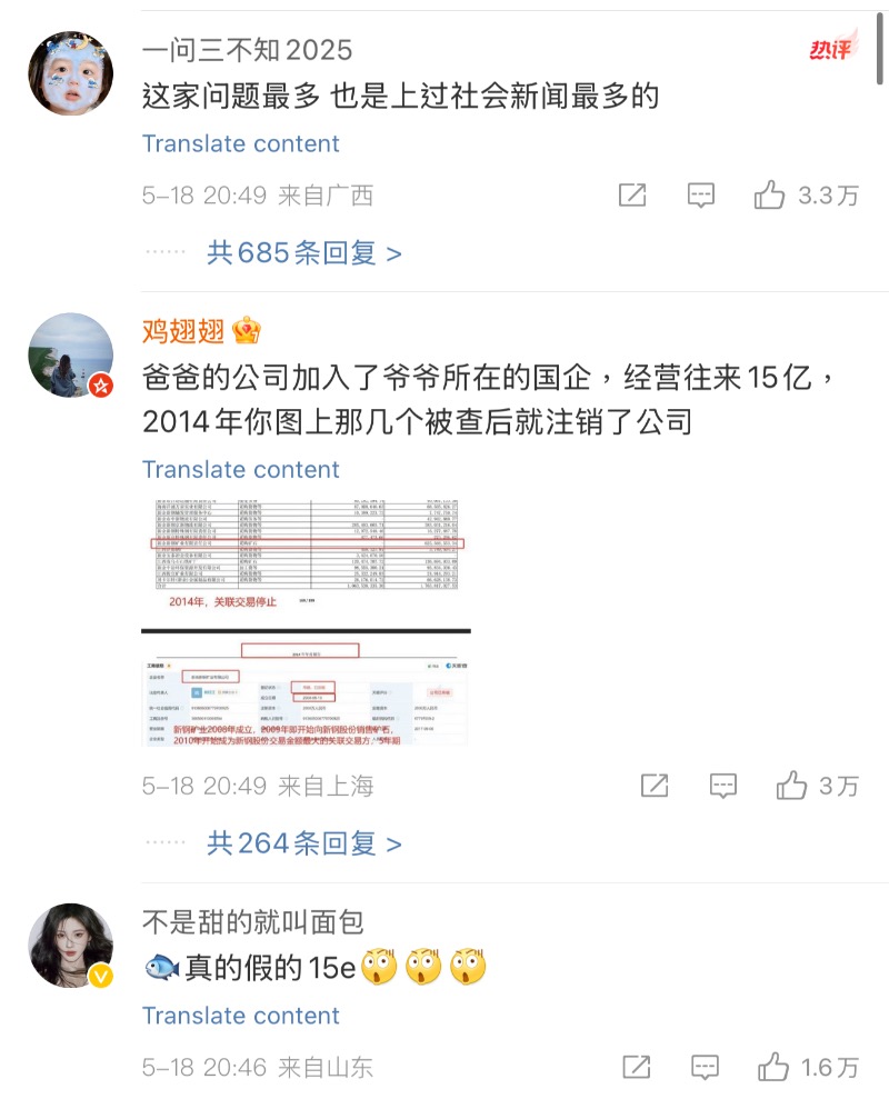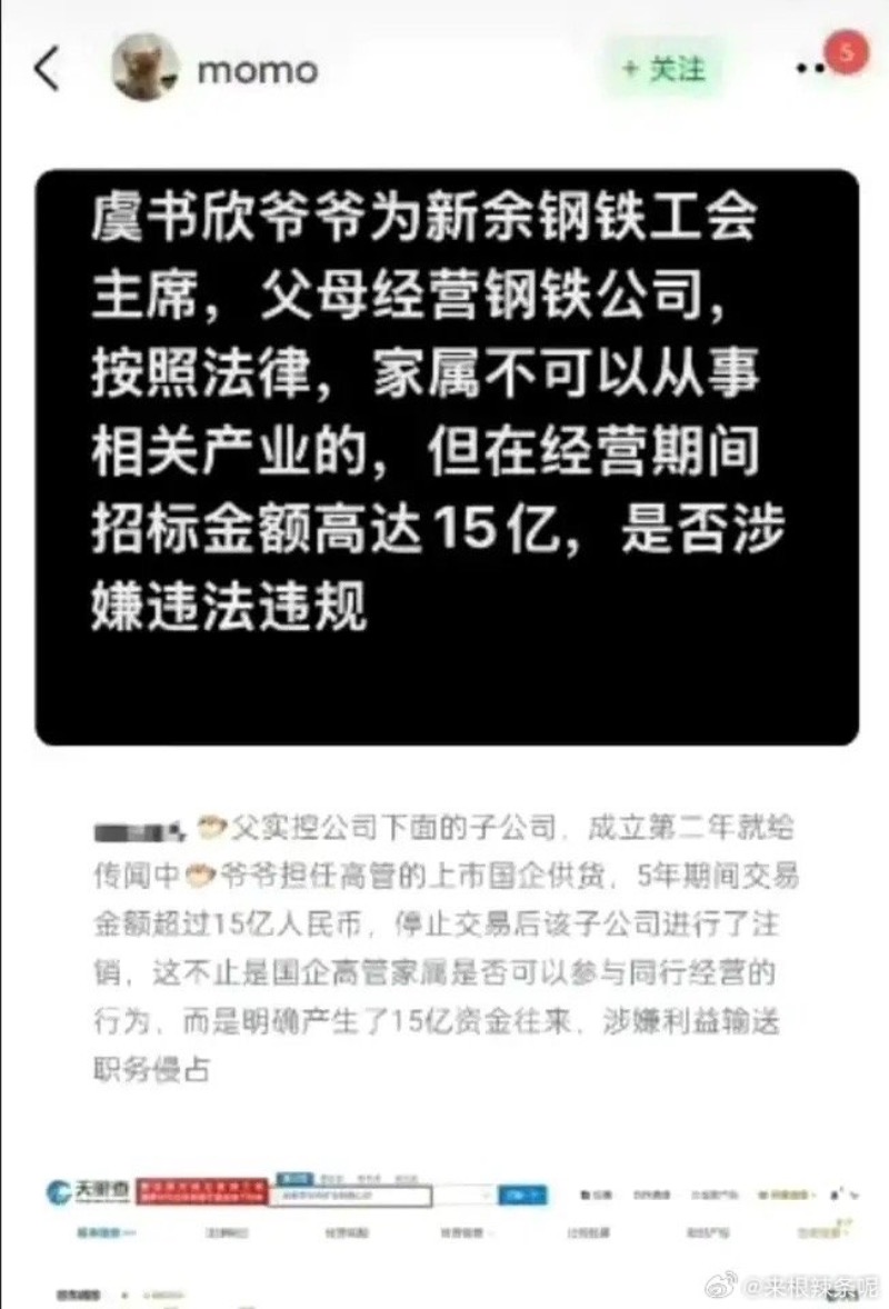 有網友扒出,虞書欣爺爺涉嫌職務侵佔,在國企任職期間,和其兒子也就是虞書欣父親成立私人公司,在2009至2013年期間,國企和該私人公司交易總額達15.5億元(人民幣,下同),引發是否有利益輸送的質疑👇