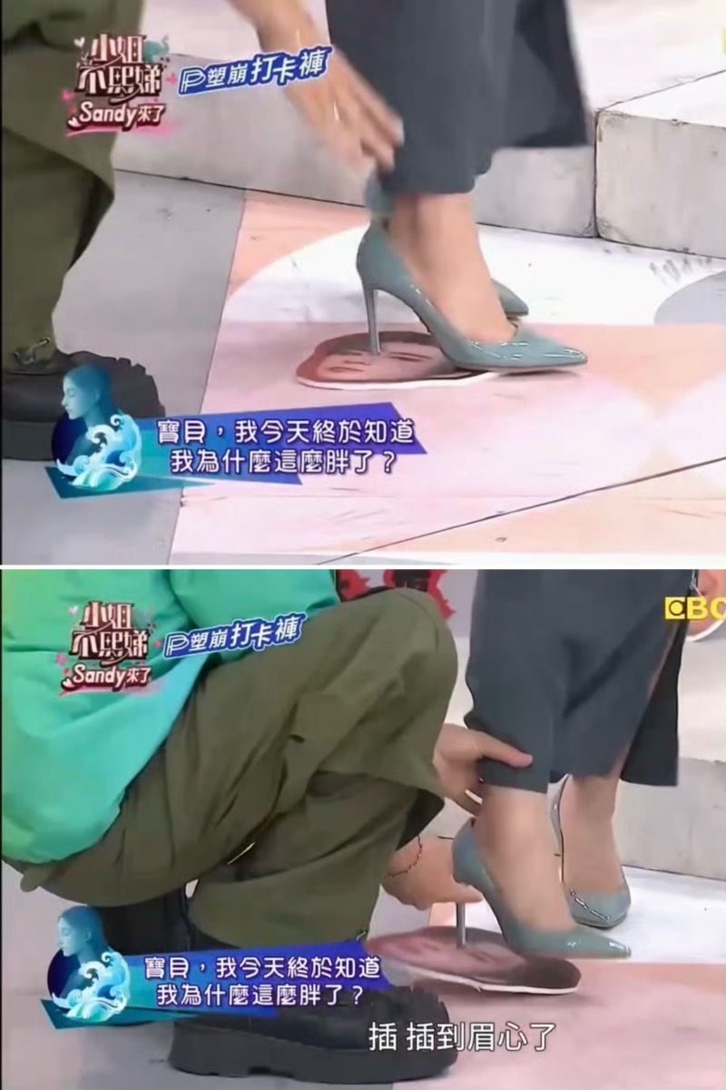 隨後直接用高跟鞋踩踏,力度之大,甚至戳破了紙板👇