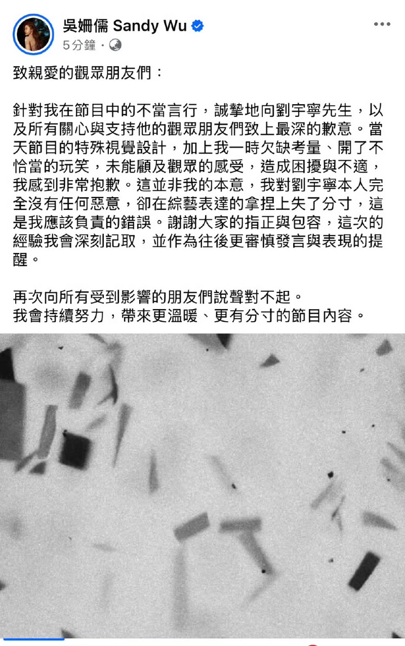 隨著熱議,吳姍儒發聲明回應道歉,表示是「節目特殊視覺設計」,但自己拿捏失了分寸,言行不當,因此對劉宇寧表示歉意👇