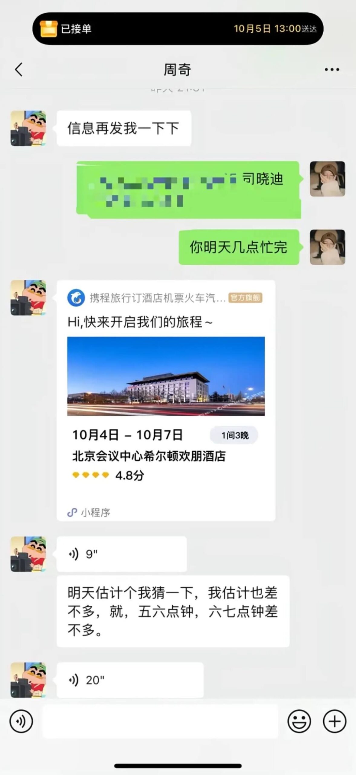 而司曉迪也公開更多之前的聊天記錄,看得出來兩個人交往很親密,周奇還在生日會(10月5號)期間,給司曉迪開了三天酒店房間。