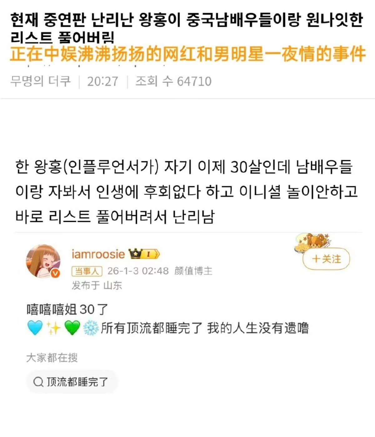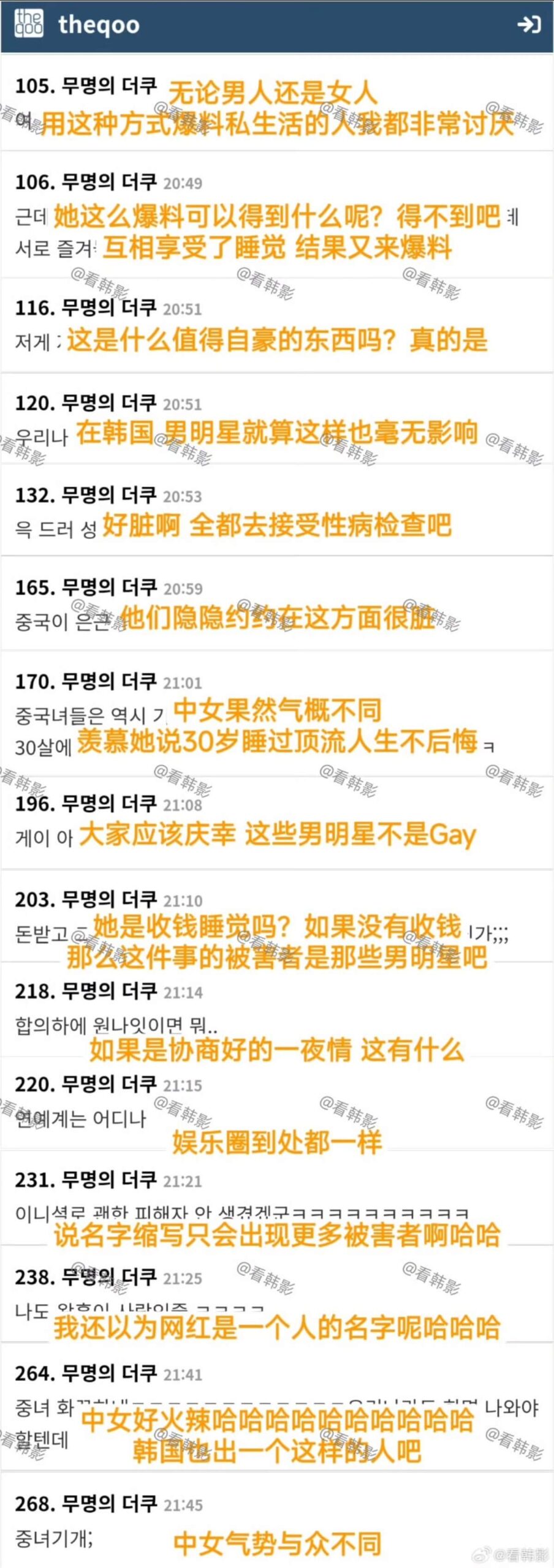 對於被爆料「一夜情」(韓網定義為一夜情),韓網搬運了司曉迪出圈言論:「嘻嘻嘻姐30了!所有頂流都睡完了,我的人生沒有遺嚕(憾)」