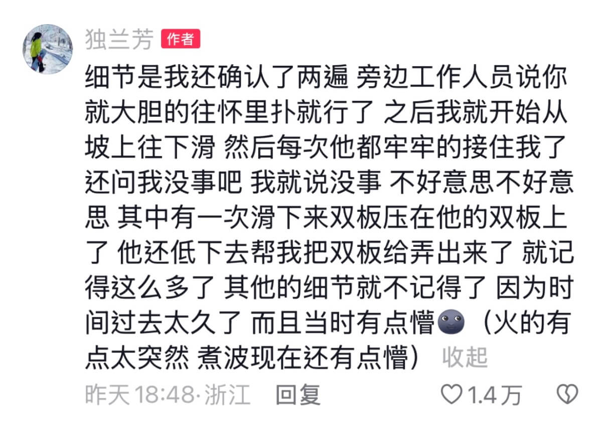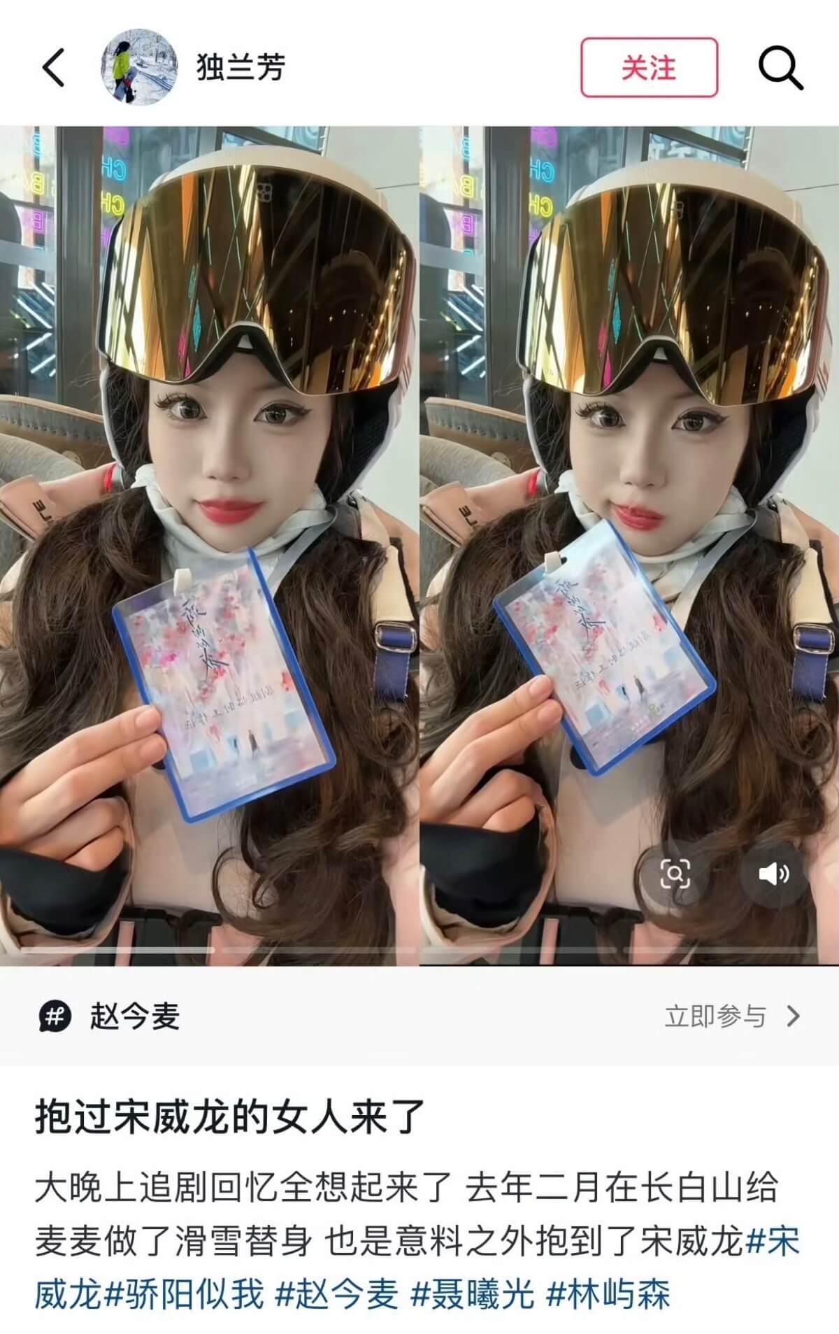 是噠,網友「獨蘭芳」分享了自己當《驕陽似我》中,趙今麥滑雪替身的經歷,表示當時為了要試鏡,所以“撲進”宋威龍懷裡好幾次👇