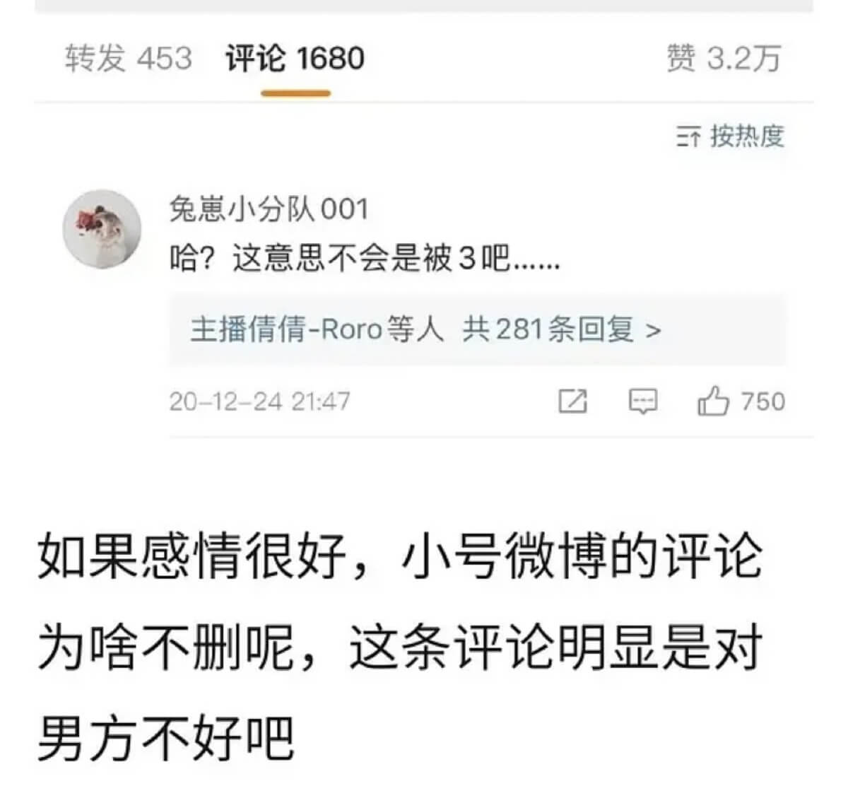 並質疑如果感情很好,為什麼不刪除這條明顯對男方不好的評論呢?