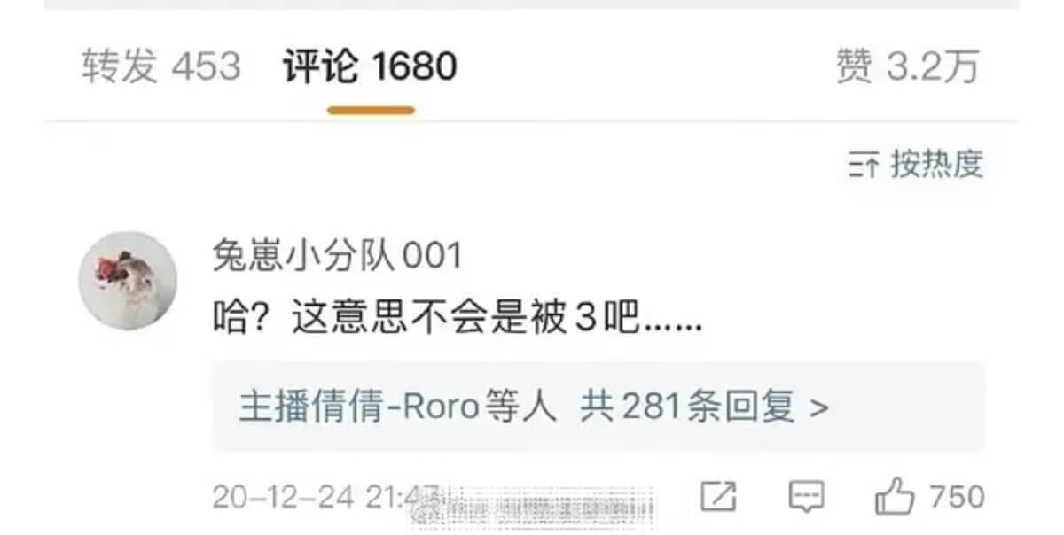 當時評論區就有這樣的留言:「哈?這意思不會是被3吧…」這個評論一直到現在都還沒有被刪除👇
