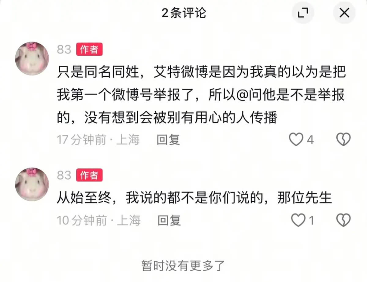 白珊珊也再次強調,自己一開始喊話真的是同名同姓,之所以會在小號艾特吳磊,是因為大號被炸號後,所以才想詢問是不是因為他的緣故。