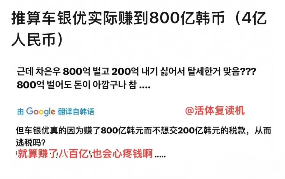 而車銀優被追繳的稅金高達了200億,難怪引起這麼高熱度!韓網從稅金方面推算,車銀優個人收入高達800億,才可能被追繳這麼高金額稅金!