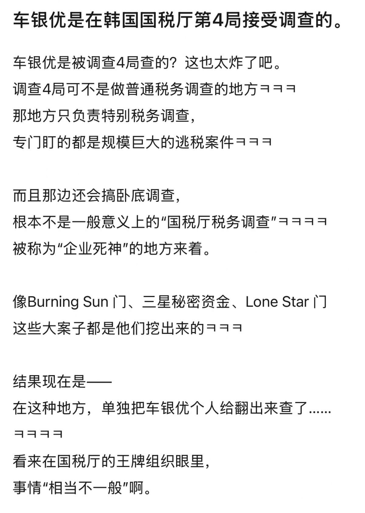-☞406樓 調查4局出手…在江華島開公司,而且國稅局是認定它是空殼公司才調查的呵呵。看起來完全沒有和其他人產生「理解差異」的空間。而且200億是史無前例的,就算說是理解差異也……呵呵呵呵,真是絕了。