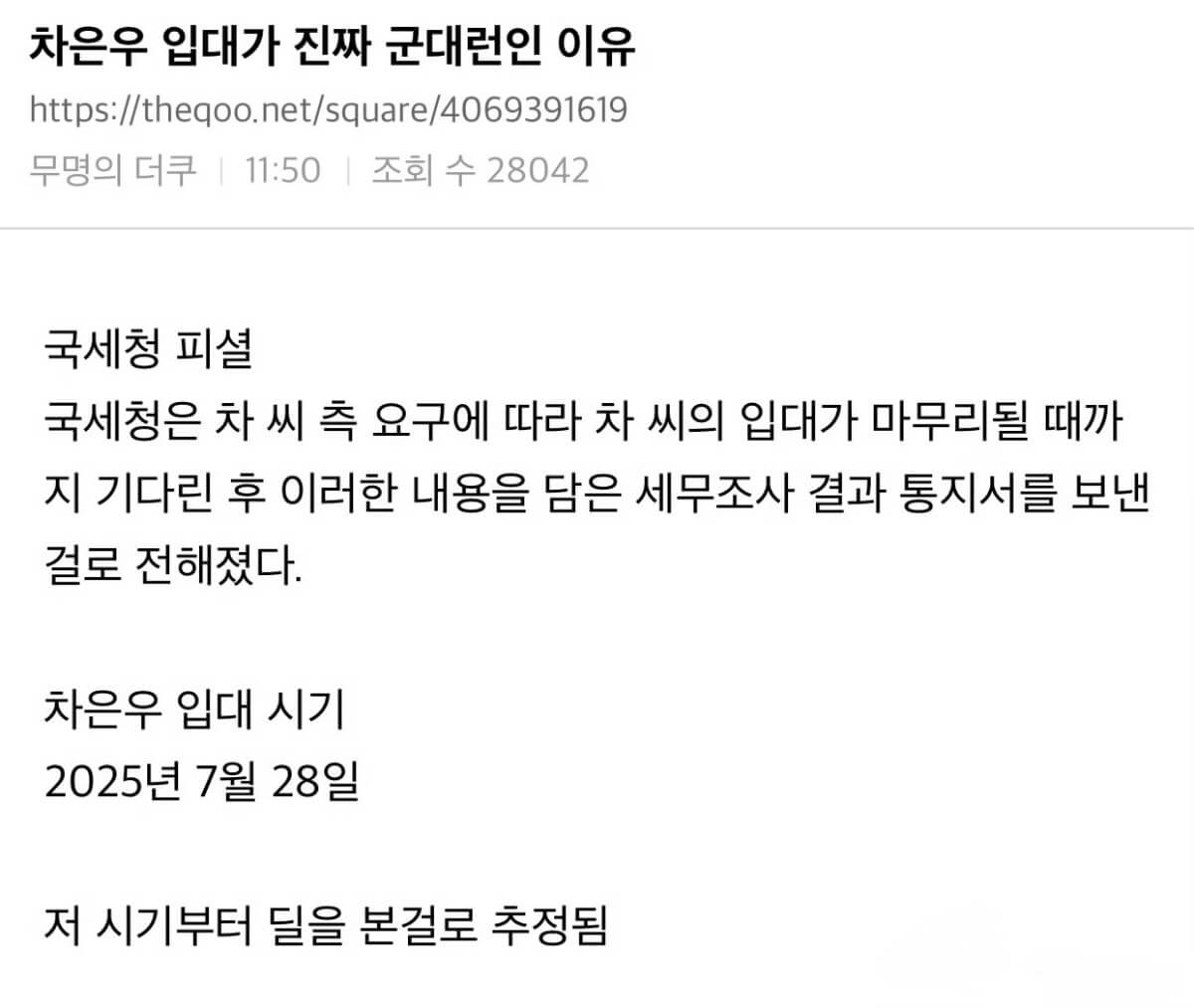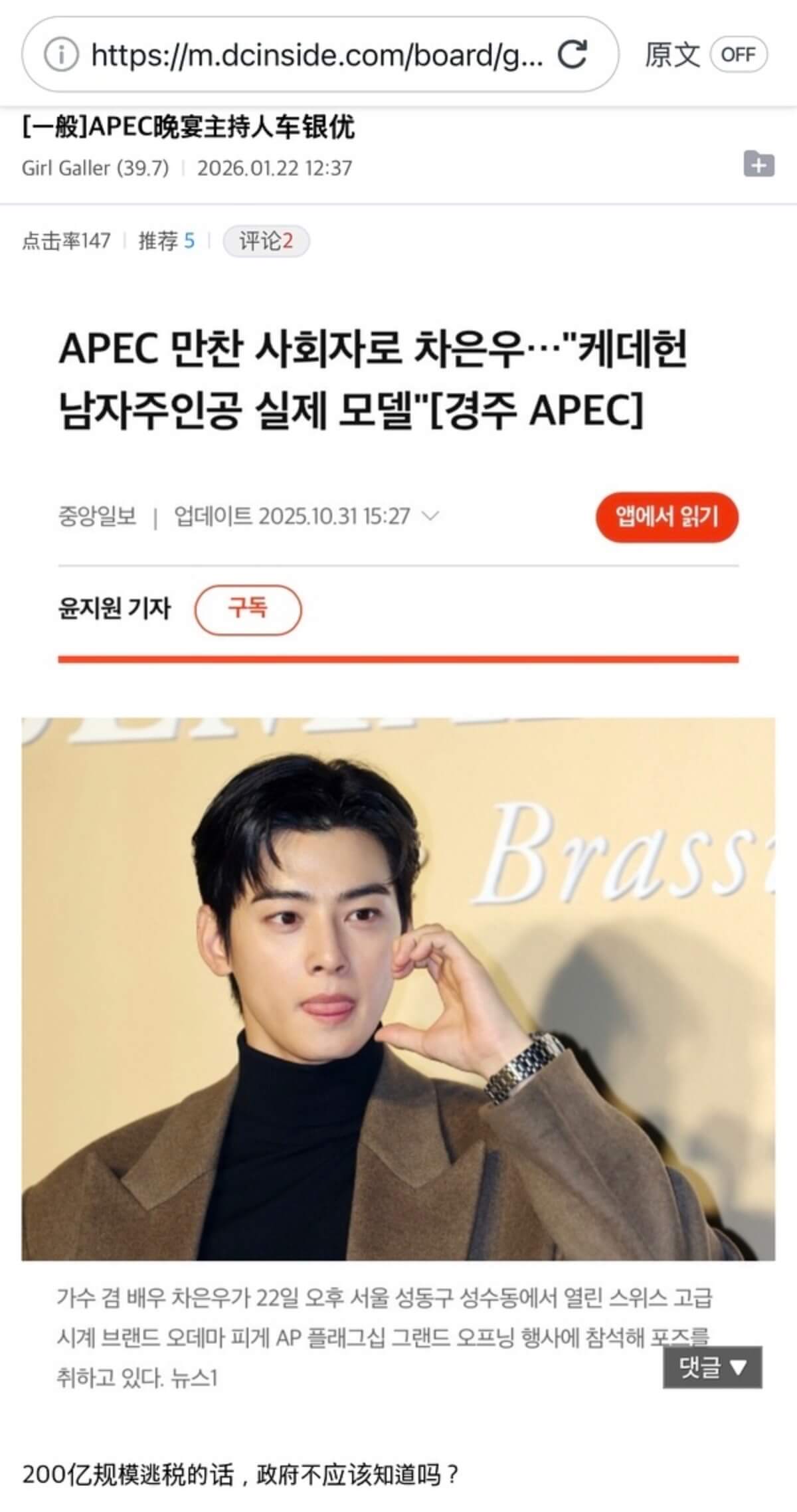 但讓不少韓網友十分驚訝的是,去年春天就開始的調查,居然在車銀優的要求下,一直等到他入伍之後才公開👇