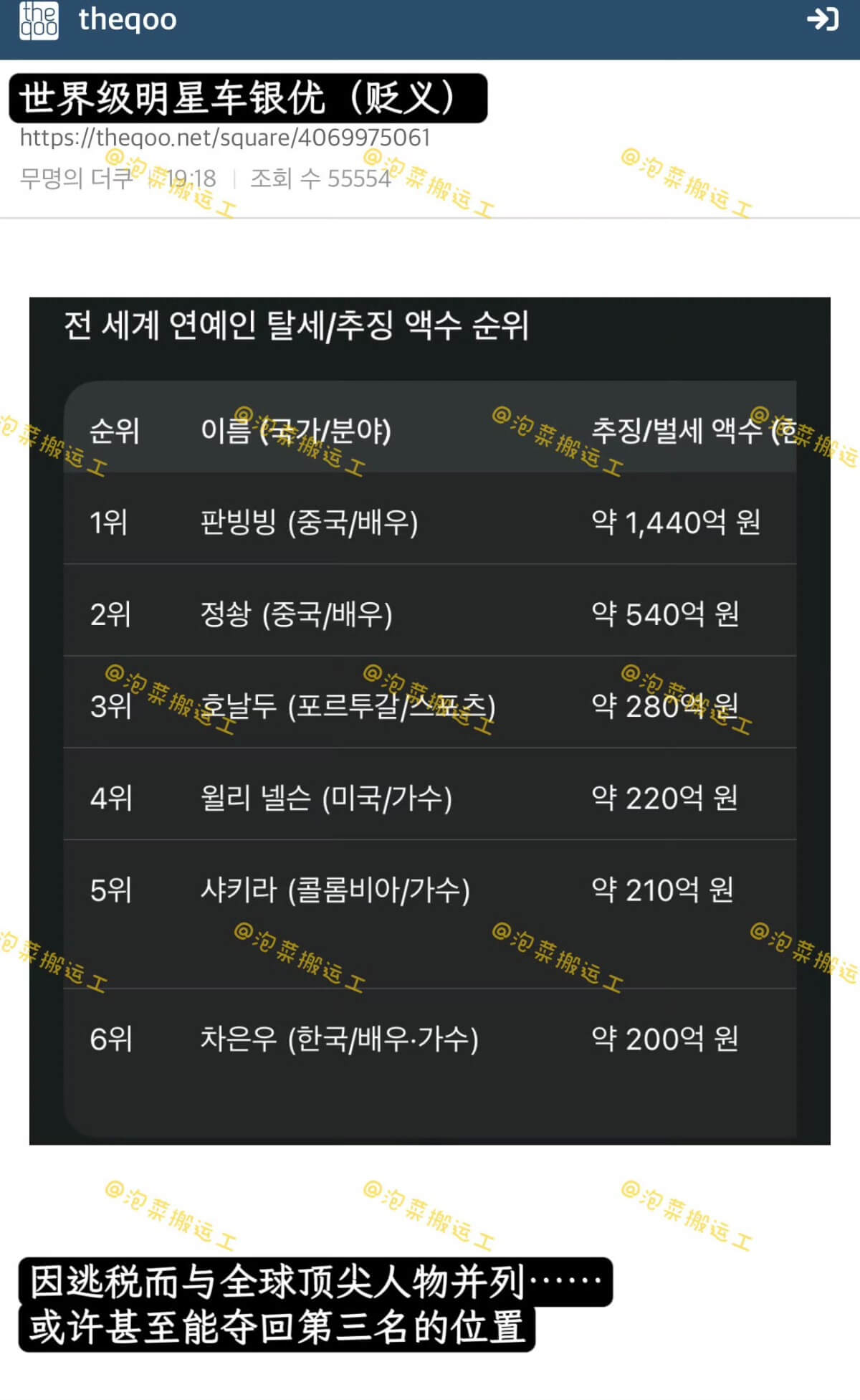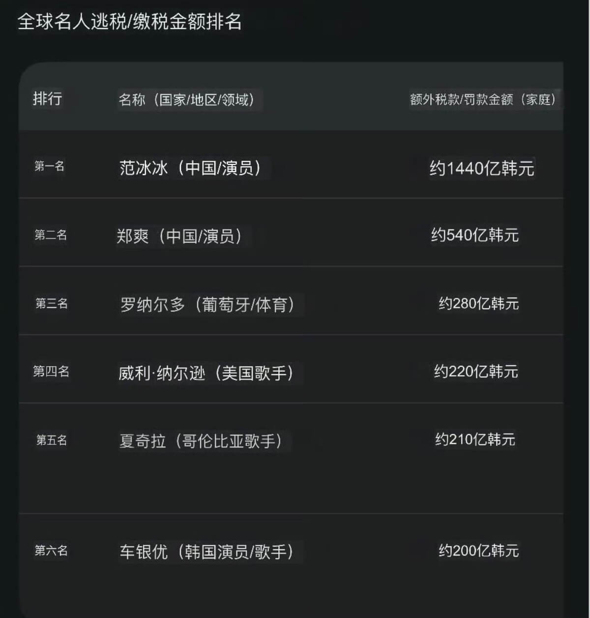 簡單來說,如果不是首爾廳調查4局出手查「企業獵人」,陰差陽錯查到車銀優頭上,可能等他退圈了,都未必會讓人發現啊!目前韓國國稅廳向其追繳約200億韓元規模的稅款,這在韓國娛樂圈是最大規模,在全球也屬頂級,這使其逃稅規模位列全球第六,前10排名如下!這次車銀優真的是不折不扣的全球頂流了啊!