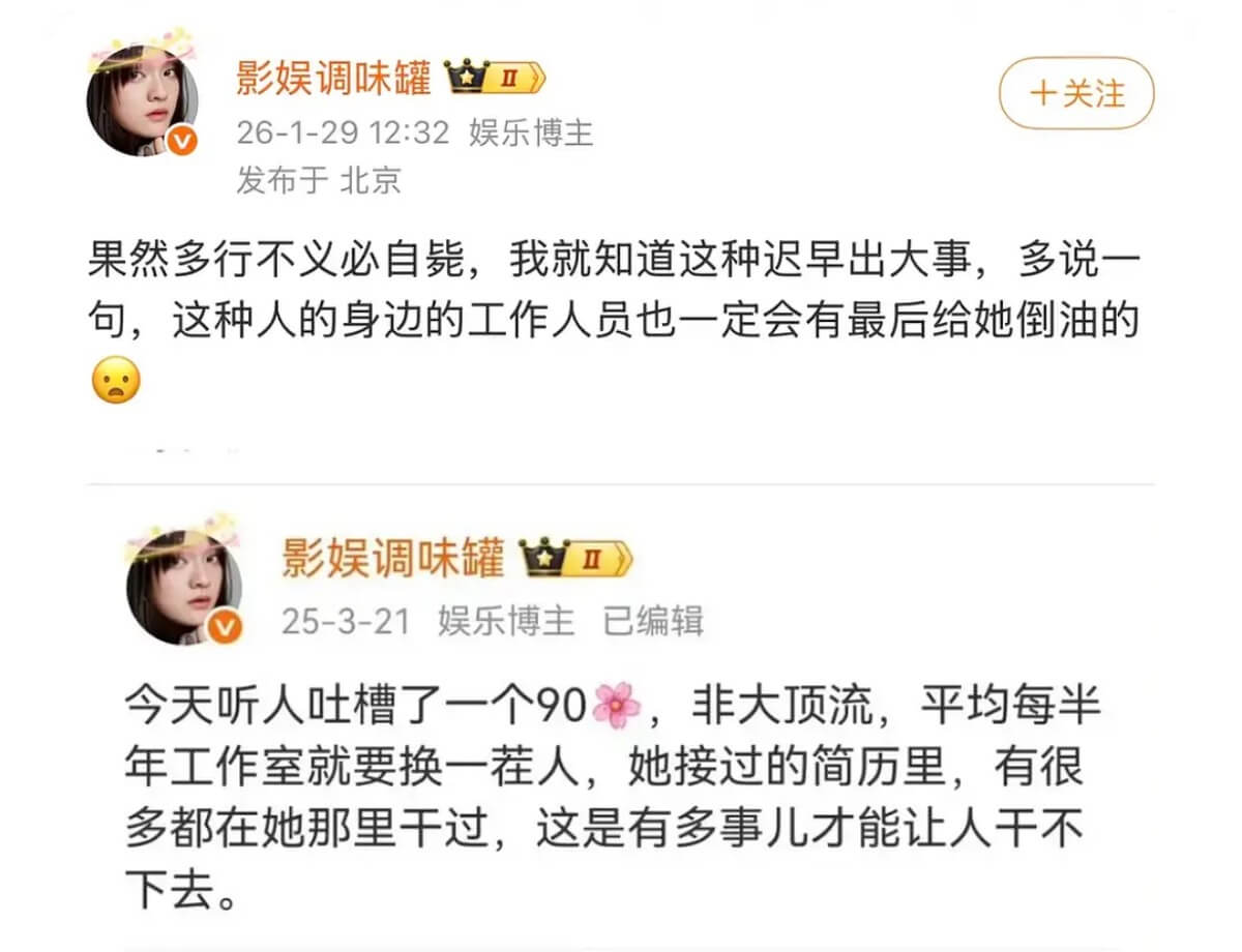 也有瓜主轉發了自己去年的爆料鐵,當時就有業內吐槽,表示某藝人不斷在換團隊,現在直接用「多行不義必自斃」來總結👇