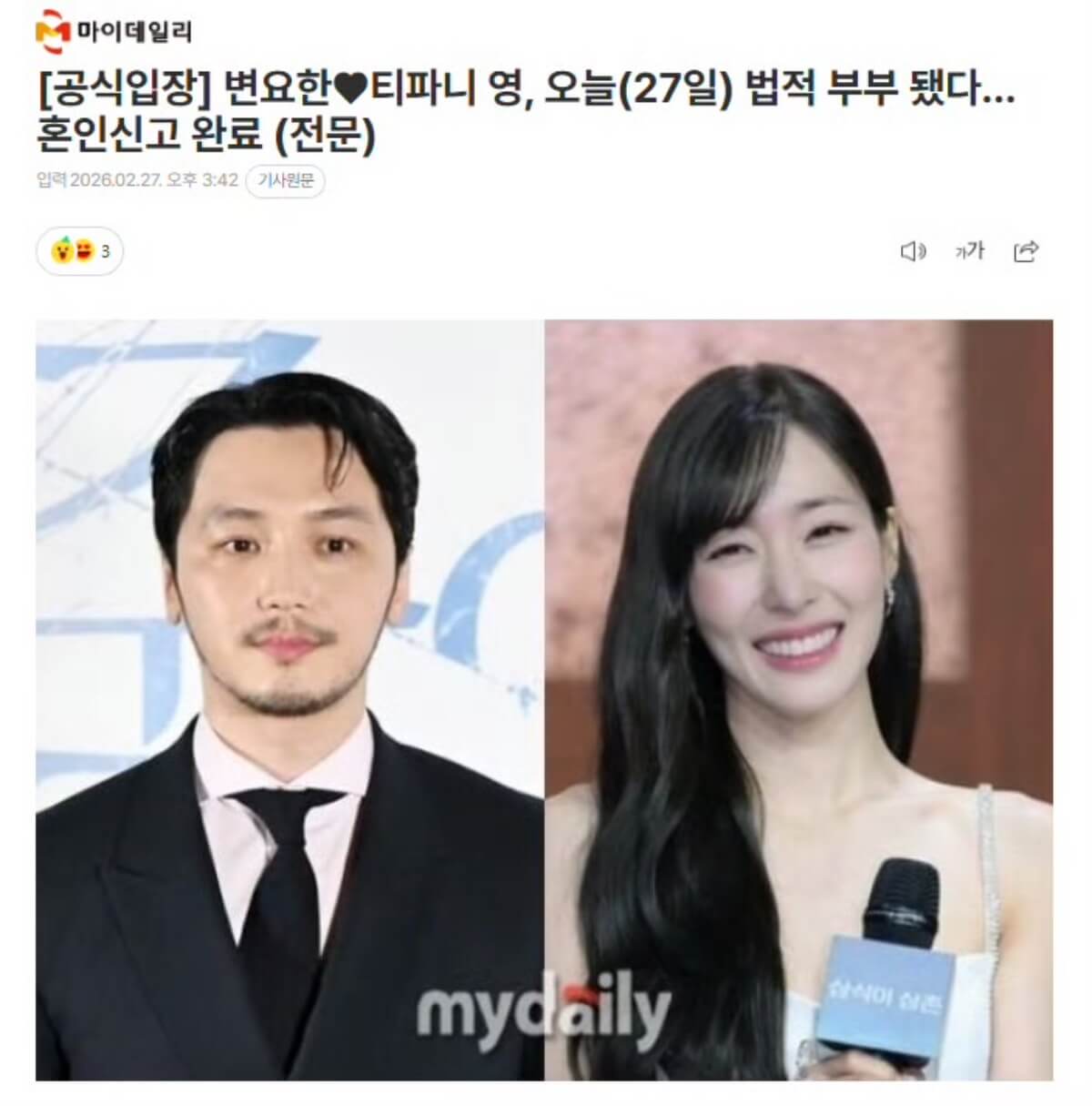 卞耀漢所屬公司TEAMHOPE於27日發布官方立場,表示:「Tiffany與卞耀漢今日基於對彼此深厚的信任與愛情,完成了婚姻登記。」
