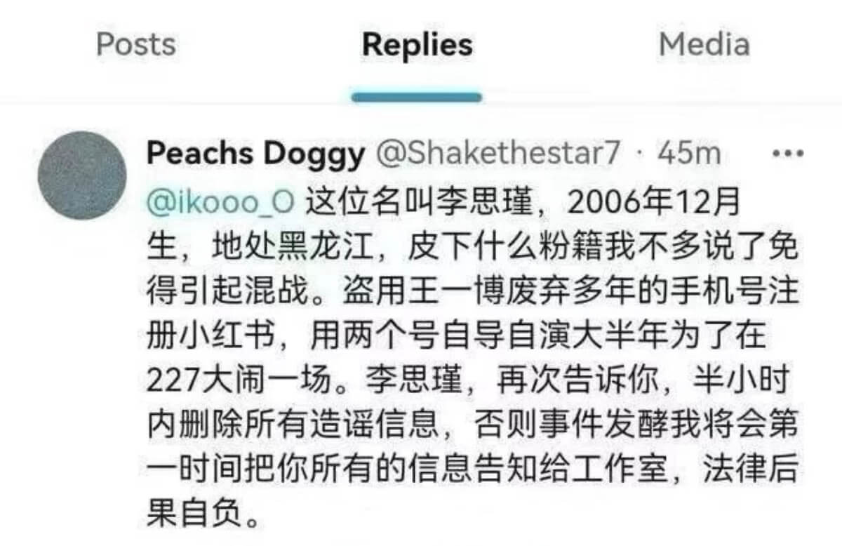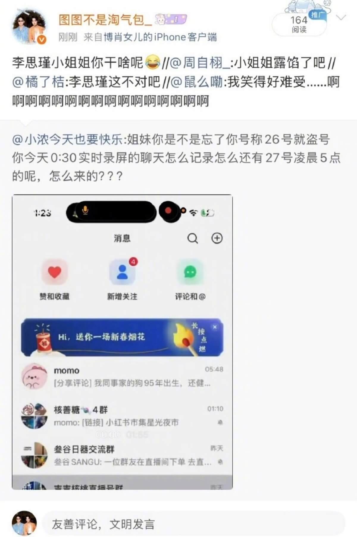 聊天記錄直接炸了熱搜榜!但很快就有網友發帖,扒出最先未打碼截圖,顯示原帳號主人已經是一個叫「李思瑾」的網友👇