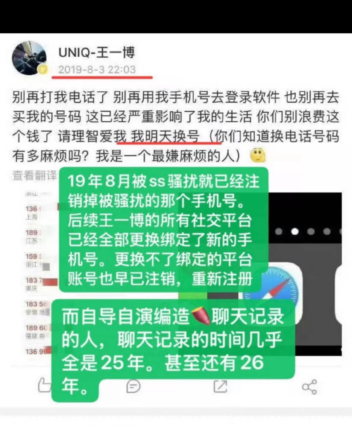 以及王一博早在2019年就發過聲明,表示電話號碼被盜號,而聊天記錄的手機號,就是舊手機號碼👇